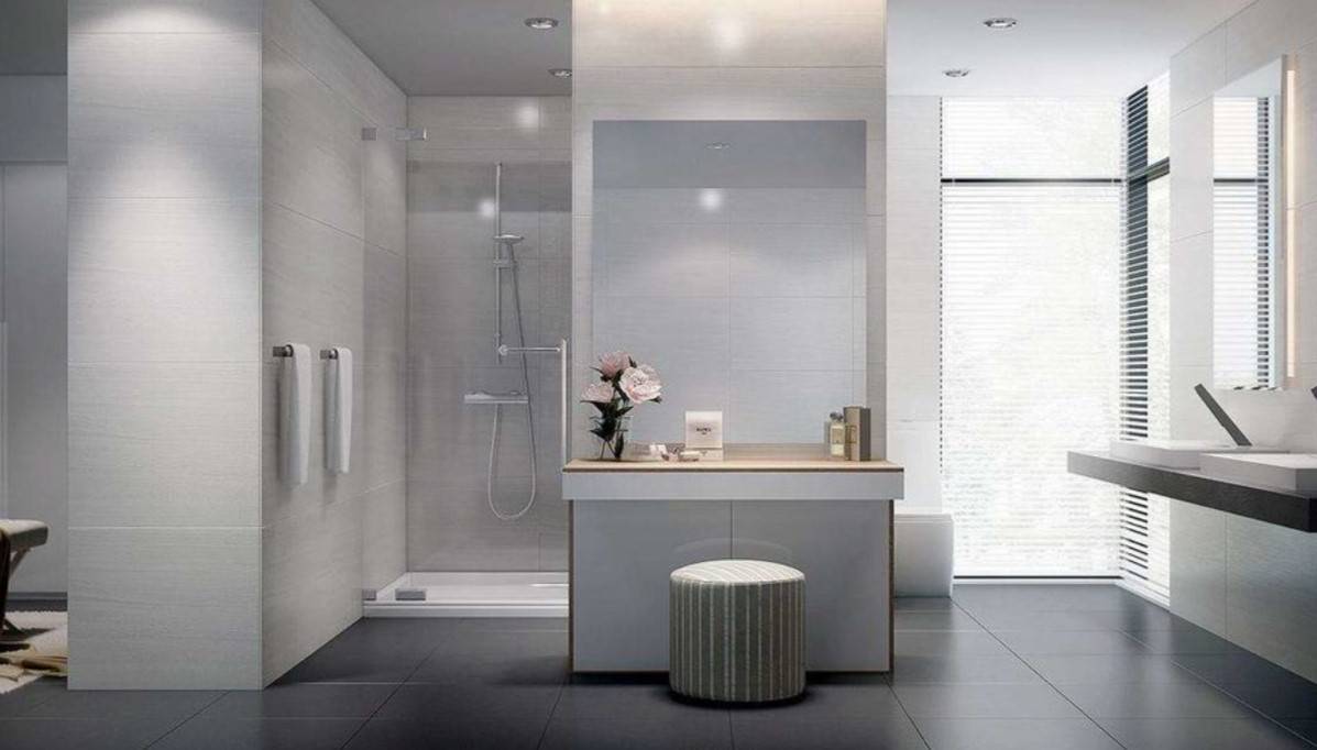 Гармоничное сочетание напольной и настенной плитки разных оттенков с эффектом дерева.