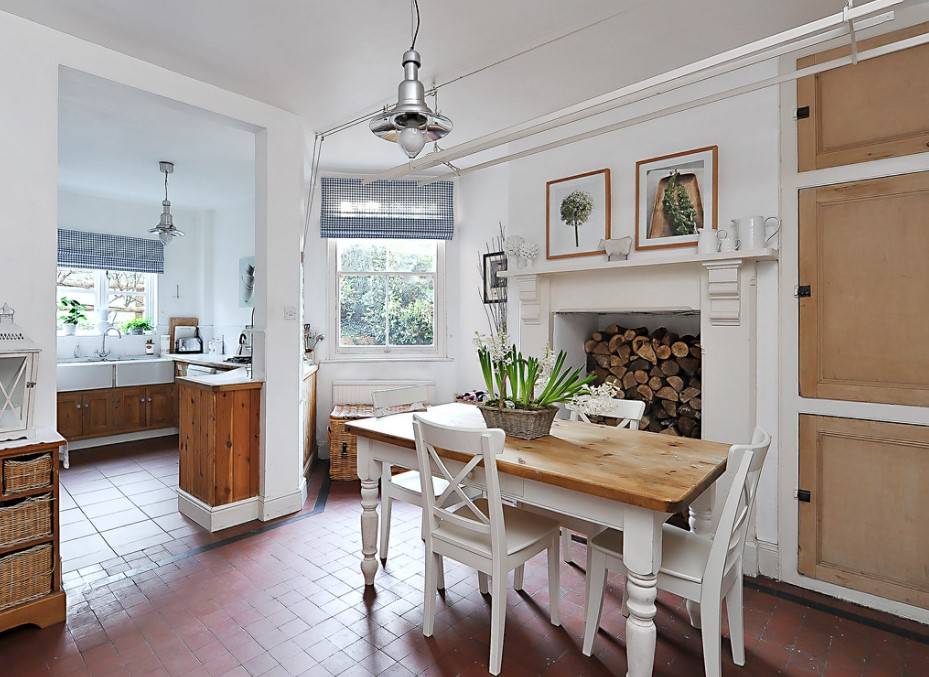 Кирпичная кладка на стенах сочетается с деревянным полом