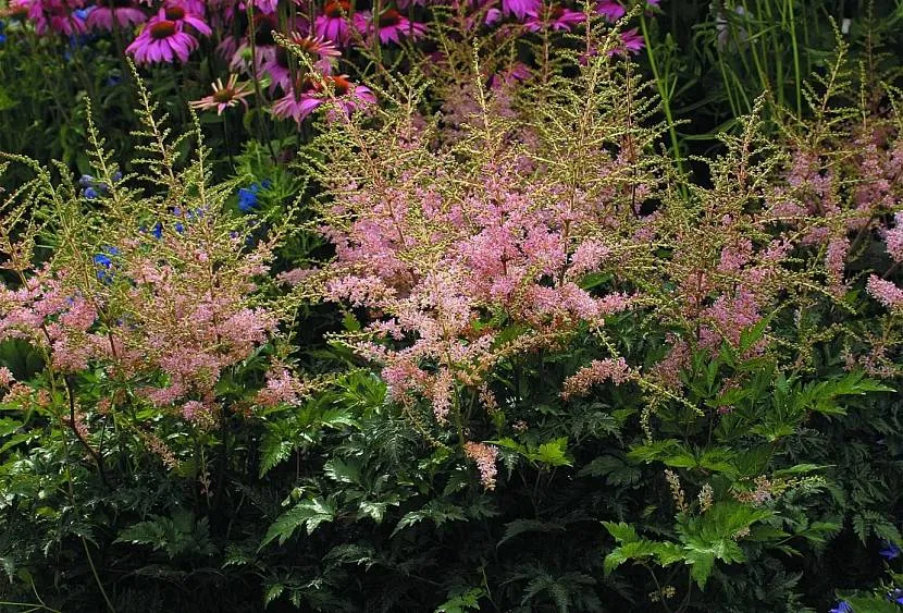 Если проект ландшафтного дизайна предусматривает разбивку миксбордера, без астильбы не обойтись. Цветок отлично сочетается с такими тенелюбивыми растениями как: