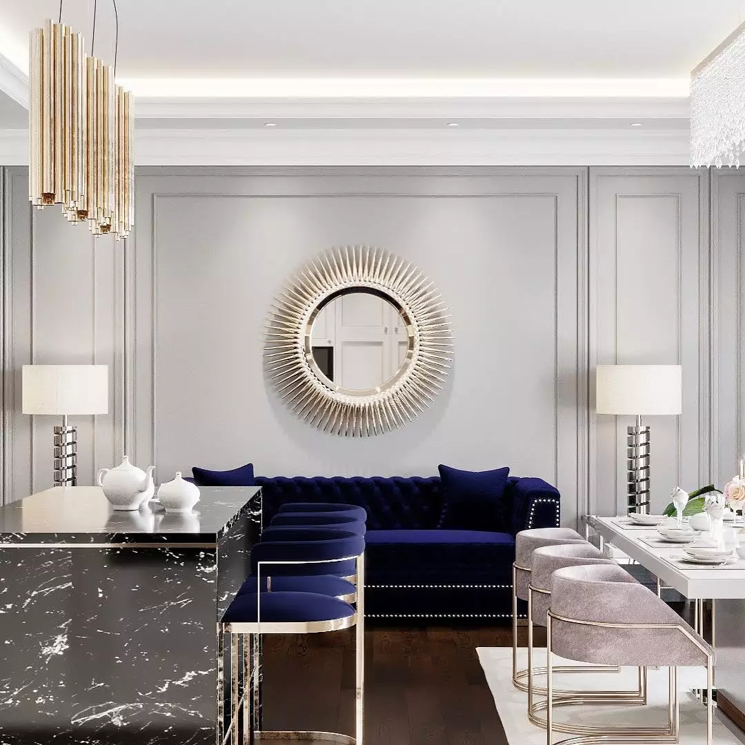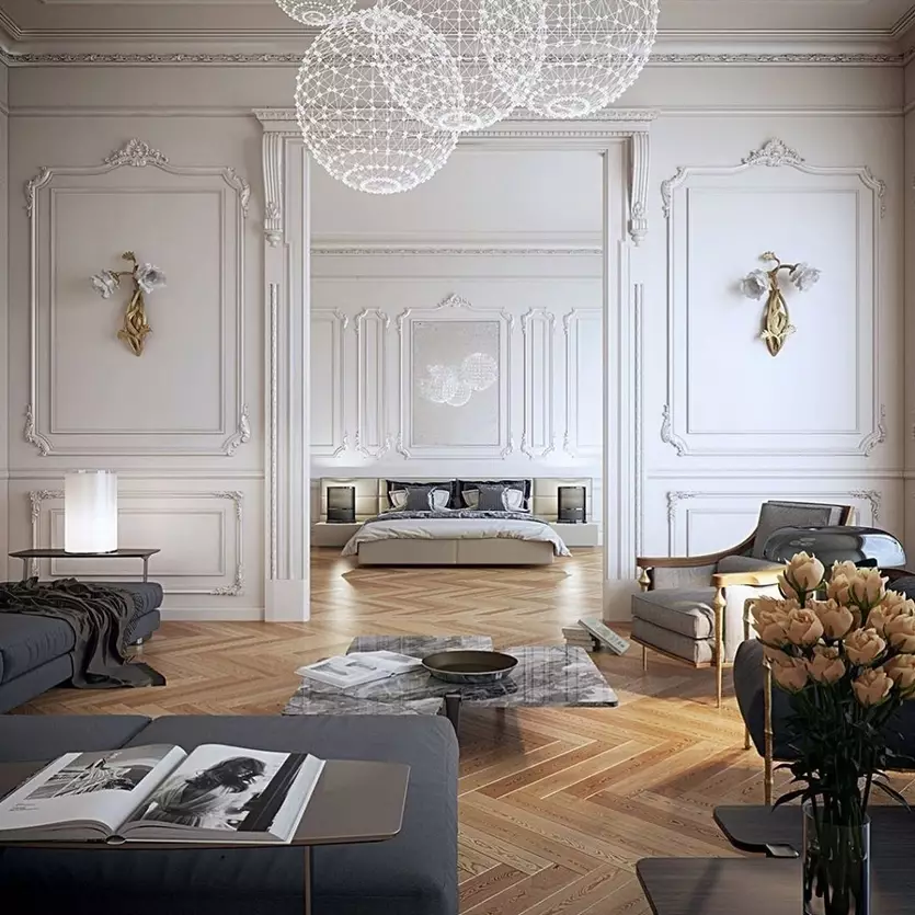 Декор в неоклассике все еще роскошный и богатый, но более приглушенный, чем в классических интерьерах. Молдинги, колонны, лепнина, пороги и стеновые панели тут более лаконичны и современны.