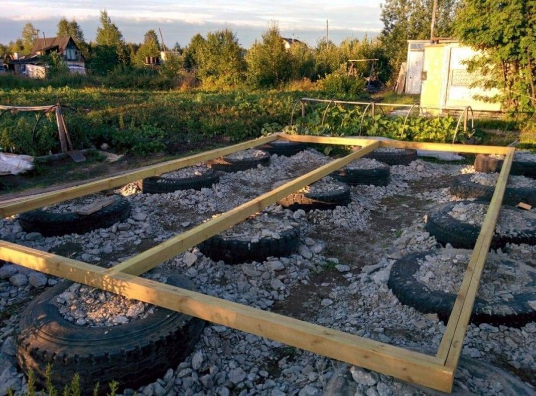 Для укладки ленточной фундаментной основы из железнодорожных шпал предварительно готовится фундаментная траншея, глубину которой определяют с учетом погодных условий региона. Если почвенный состав склонен к осыпаниям, то на высоту фундаментной основы и цокольной части выставляется опалубочная конструкция, изготовленная из деревянных щитов.
