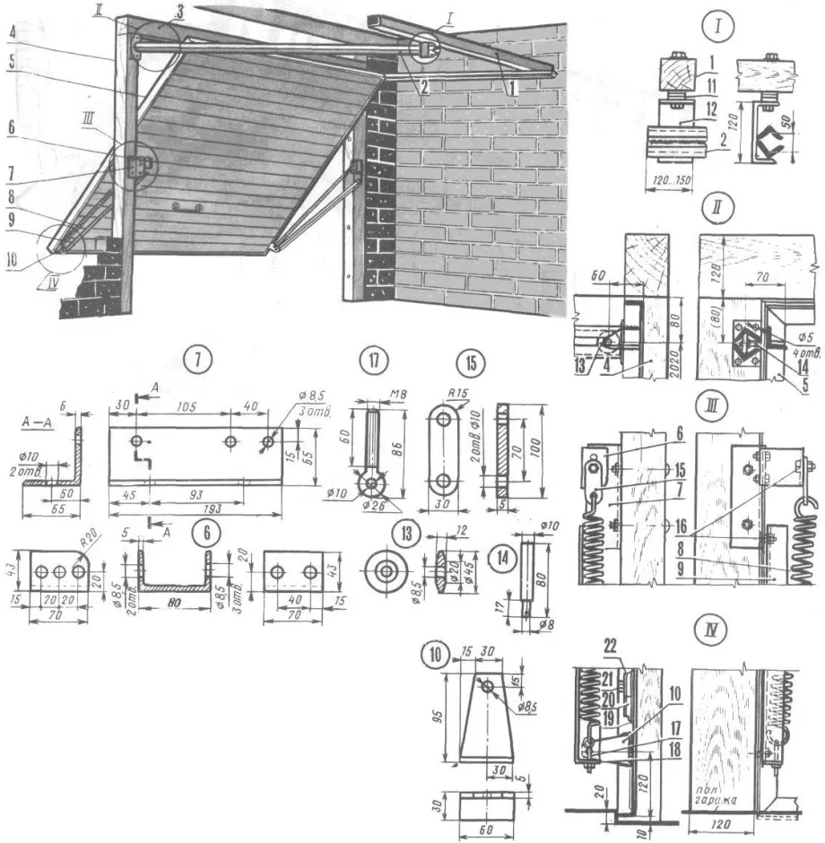 Подъемно-поворотная конструкция относится к простым механизмам. Цельная створка будет подниматься за счет работы привода (рычажно-шарнирного или системы противовесов).