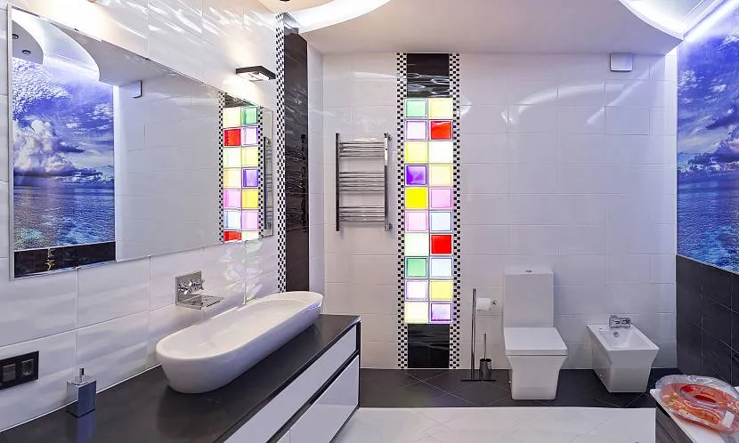 В ванной комнате загородного дома можно заложить окно стеклянными блоками с цветными рисунками или витражами, при попадании солнечного света окно выглядит интересно и необычно.