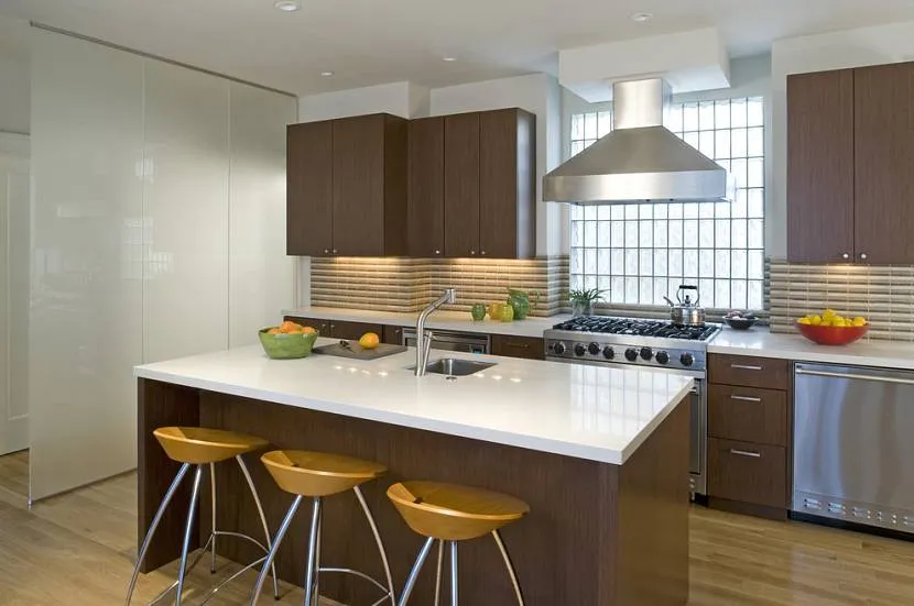 Стеклоблоки небольших размеров можно разместить на стене над плитой или возле раковины, спрятав стены от воздействия влаги и тепла.