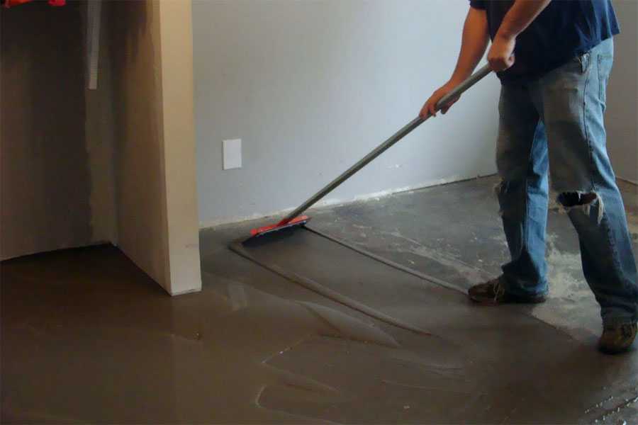 Выливать готовый раствор на пол нужно начинать от противоположной входу стены. Вылитый раствор следует разровнять при помощи шпателя и валика.