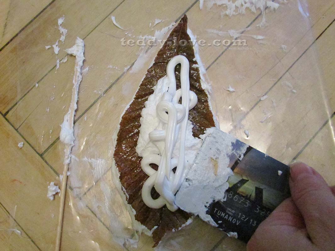 Итак, Как сделать форму из силиконового герметика своими руками!Выдавила пасту, примерно по размеру листика разровняла. Пригодилась старая кредитка.