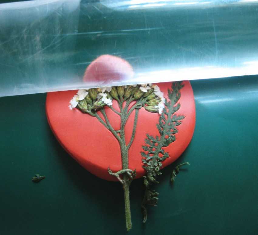 - Сам листок промываем водой, смазываем подсолнечным маслом. Прикладываем листок к герметику, слегка надавливаем пальцем (не переусердствуйте, не то получится дырка). Собираем лишний герметик вокруг при помощи того же шпателя.