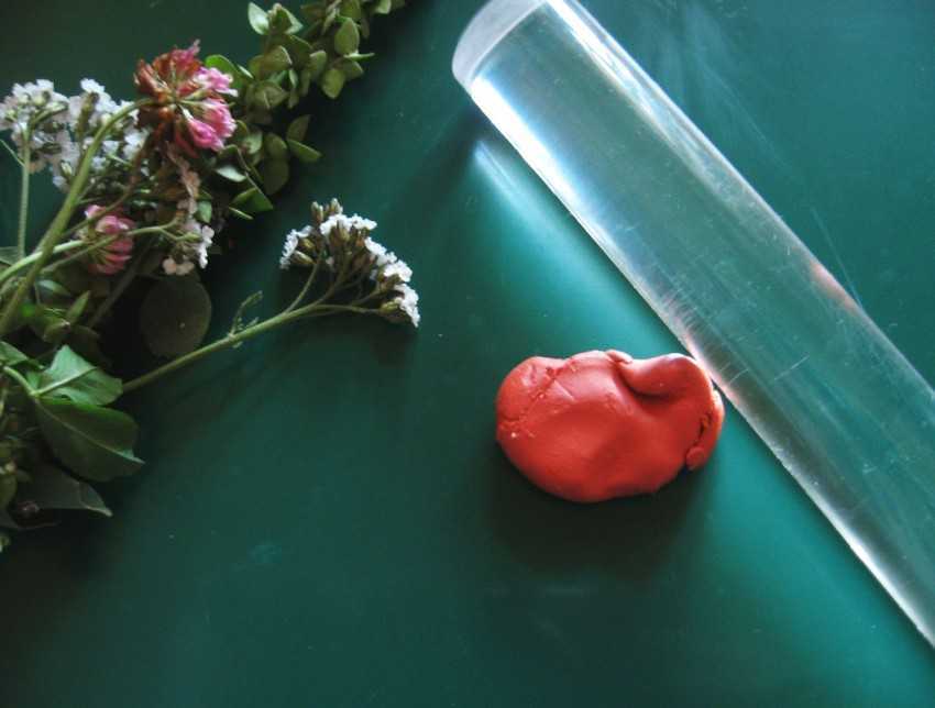 Из полимерной глины надо вылепить сложную фигуру: ее верхняя часть напоминает вытянутую ножку, а низ похож на утолщенную каплю. Прижмите заготовку к столу, делая основание плоским.