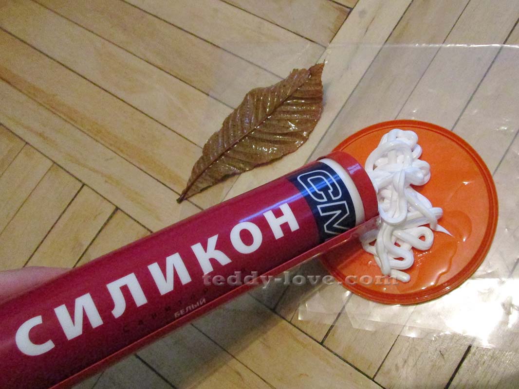 Силиконовую пасту для изготовления молдов заменила самым дешевым герметиком, на котором большими буквами было написано «Силикон». Стоил герметик около 100 рублей, кажется 120-130 вся банка, можно сделать кучу молдов, а еще впридачу останется на изготовление десятка силиконовых форм для мыла. Тут же купила так называемый пистолет для флакона за 35 рублей. (Покупала в Оби-дыбенко). В общем, для отливки силиконовых форм своими руками мне больше ничего не понадобилось, если не считать больших листьев, найденных на улице (наверное каштана), капельки самого простого подсолнечного масла, старой кредитки для выравнивания массы и подложки — прозрачной папки. Делать молд удобно и во всяких одноразовых пластиковых контейнерах, в которые кладут салаты и тому подобное на развес, тогда молд будет красивой формы снизу и с боков.