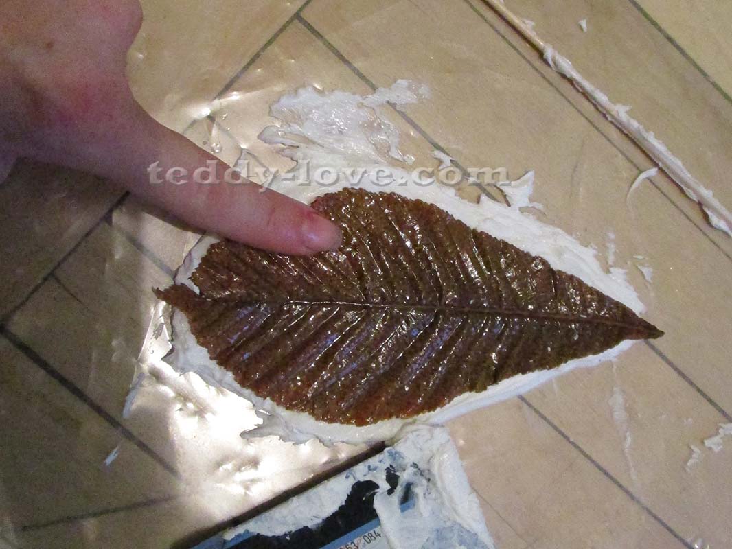 Первую заготовку раскатываем так, чтобы получить пластинку толщиной в 0,5 см. Сверху кладем сухой листик или искусственный листок с четким рельефом.