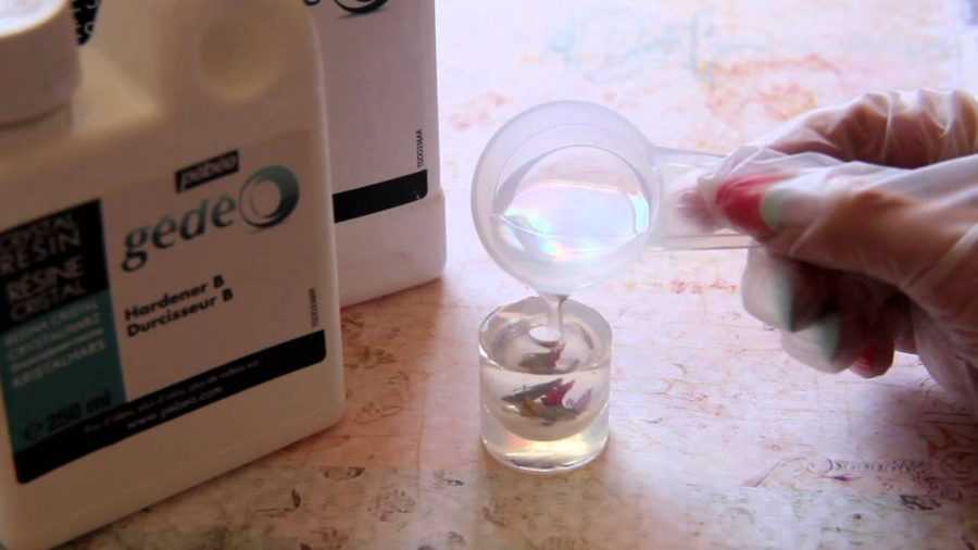 Все ингредиенты соединяются в чистой емкости, причем отвердитель добавляется в смолу, а не наоборот. Неаккуратное замешивание портит рабочий материал и приводит к образованию трещин и пятен после полимеризации. При соединении составов перемешивайте их очень тщательно и медленно (на протяжении 5–7 минут), помните, что у смолы начинается тепловая реакция. Если она станет очень бурной, субстанция может закипеть и испортиться.