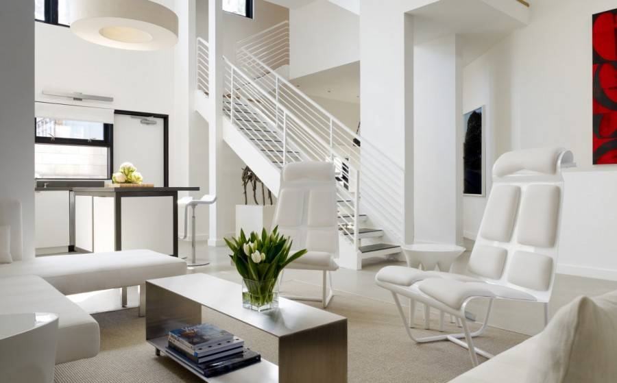 Использование стеклянных или пластиковых прозрачных перил в виде экранов позволяет создать более легкий образ лестницы для современного интерьера. Единственный недостаток – отсутствие перил в идее, к которому мы привыкли, невозможность опираться на крепления. Но при таких коротких маршах этот недостаток несущественен, если только в доме нет пожилых людей с проблемами передвижения.