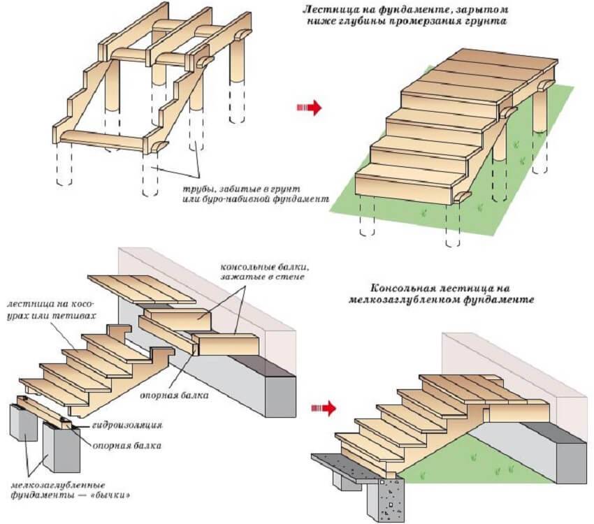 - конструкции на косоурах – состоят из балок, которые по отдельности крепятся к основанию (изготавливаются из дерева, металла и бетона);