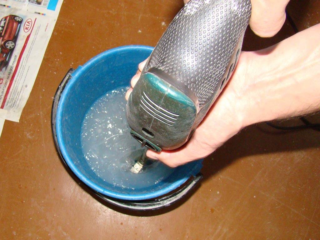 - дальнейшее размешивание желательно проводить миксером или дрелью с насадкой — они разобьют все маленькие комки, что сложно сделать вручную;