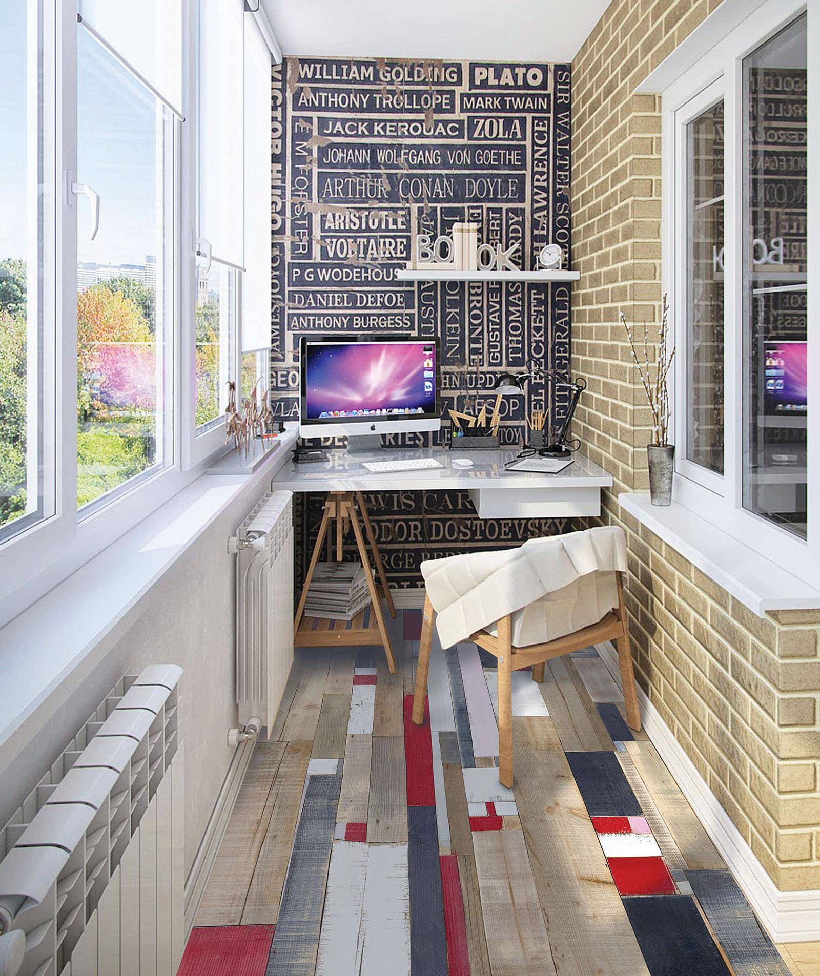 В малогабаритных квартирах площадь следует использовать рационально, поэтому на лоджии часто обустраивают удобные кабинеты, состоящие из небольшого стола, парочки подвесных полок и вращающегося кресла.