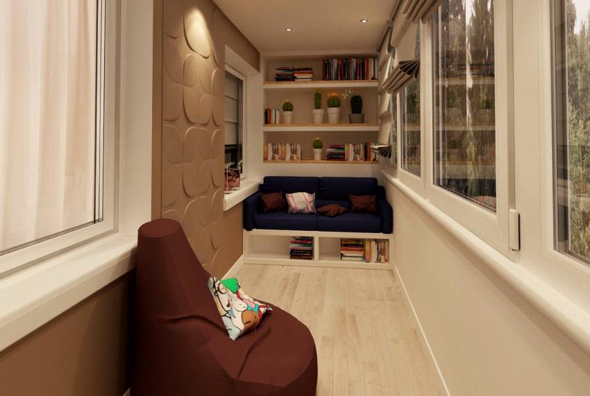Мягкое глубокое кресло или небольшая оттоманка создадут уютную зону релакса, где запросто уединиться, помечтать и расслабиться. Небольшое бра и маленький коврик из меха помогут воссоздать атмосферу комфорта. Очень часто лоджию превращают в миниатюрный рабочий кабинет.