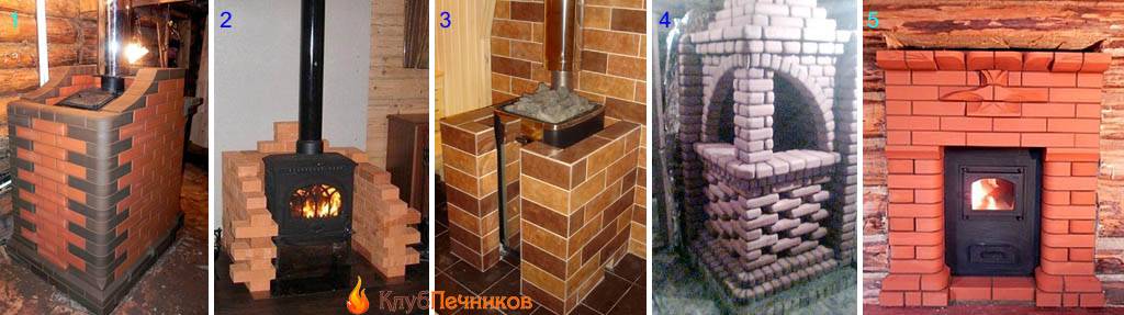 Как внешне проявляются основные способы кирпичной обкладки печей, показано на фото. Поз. 1 – сплошная облицовка. Снижает тепловой КПД печи: конструкции металлических печей рассчитаны на быструю теплоотдачу. Вдруг на пути тепла от топки в помещение появляется дополнительная преграда, ему не остается ничего иного, как вылететь в трубу. Применяется сравнительно редко, в случаях, когда значительная часть тепловой мощности печи отбирается водогрейным контуром или в декоративных целях, когда эффективность печи особого значения не имеет либо вообще нежелательна. Напр., если каминопечь просто украшает отапливаемое помещение.