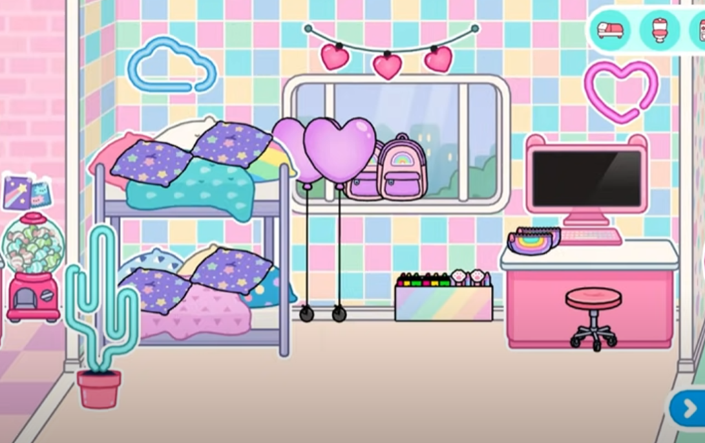 В соседней комнате можно также сделать вторую спальню. Она немного больше предыдущей, а значит в ней можно уместить двухъярусную кровать, много разноцветных вещичек и огоньков. Розовые стол и компьютер очень сочетаются с радужным интерьером.
