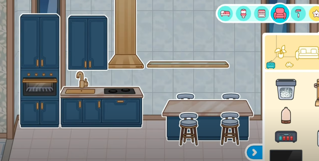Обратите внимание на синий стол, к которому подходят барные стулья