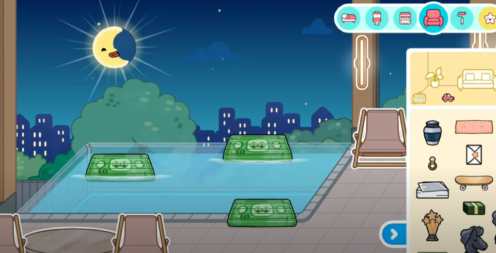 На втором этаже мы можем увидеть выход на террасу с бассейном. Можете добавить немного надувных матрасов и шезлонгов.