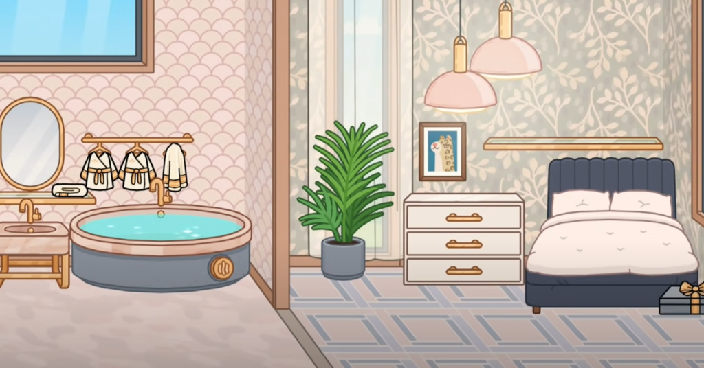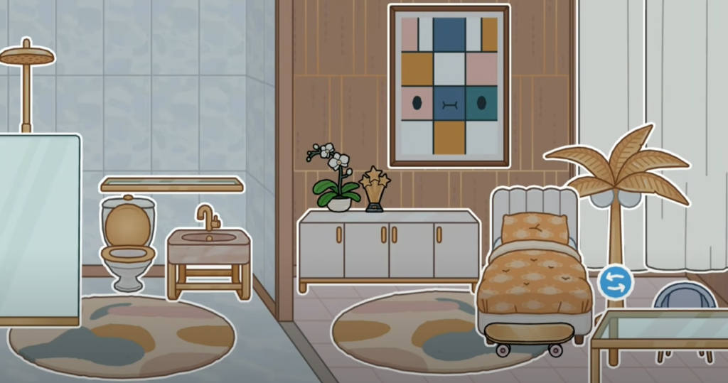 Роскошные предметы нас ожидают в ванной комнате и спальне. Золотая пальма очень гармонирует со стеклянным столиком и скейтбордом.