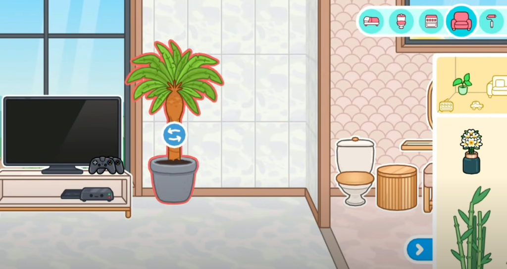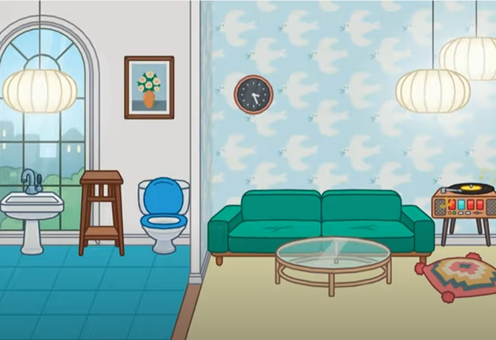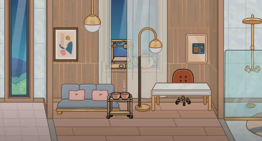 Этот дом имеет очень большой зал, что само наводит на мысль — разместить в нем комнату для отдыха и принятия гостей. Можно добавить большой диван, телевизор и игровые приставки.