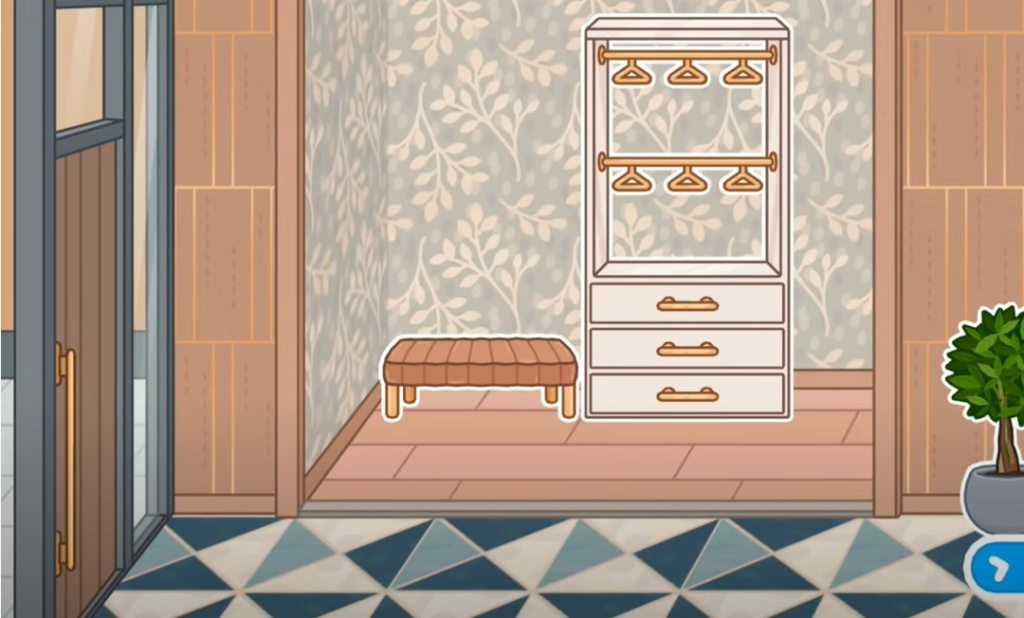 В прихожей можно поставить бело-золотую вешалку и пуфик.
