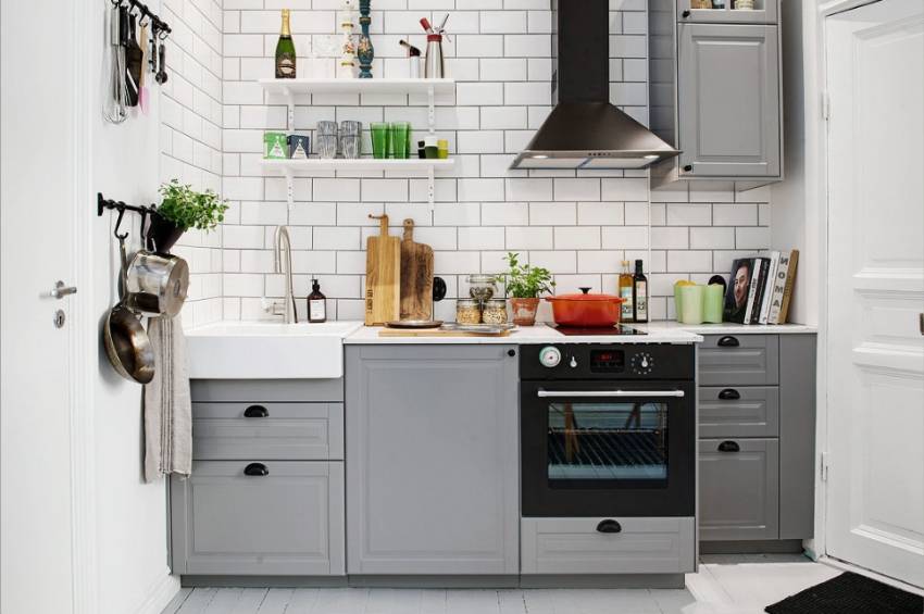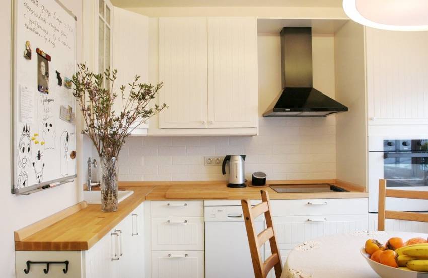 На маленькой кухне обязательно должна быть установлена хорошая мощная вытяжка, которая не позволит посторонним запахам проникать в жилые комнаты квартиры.