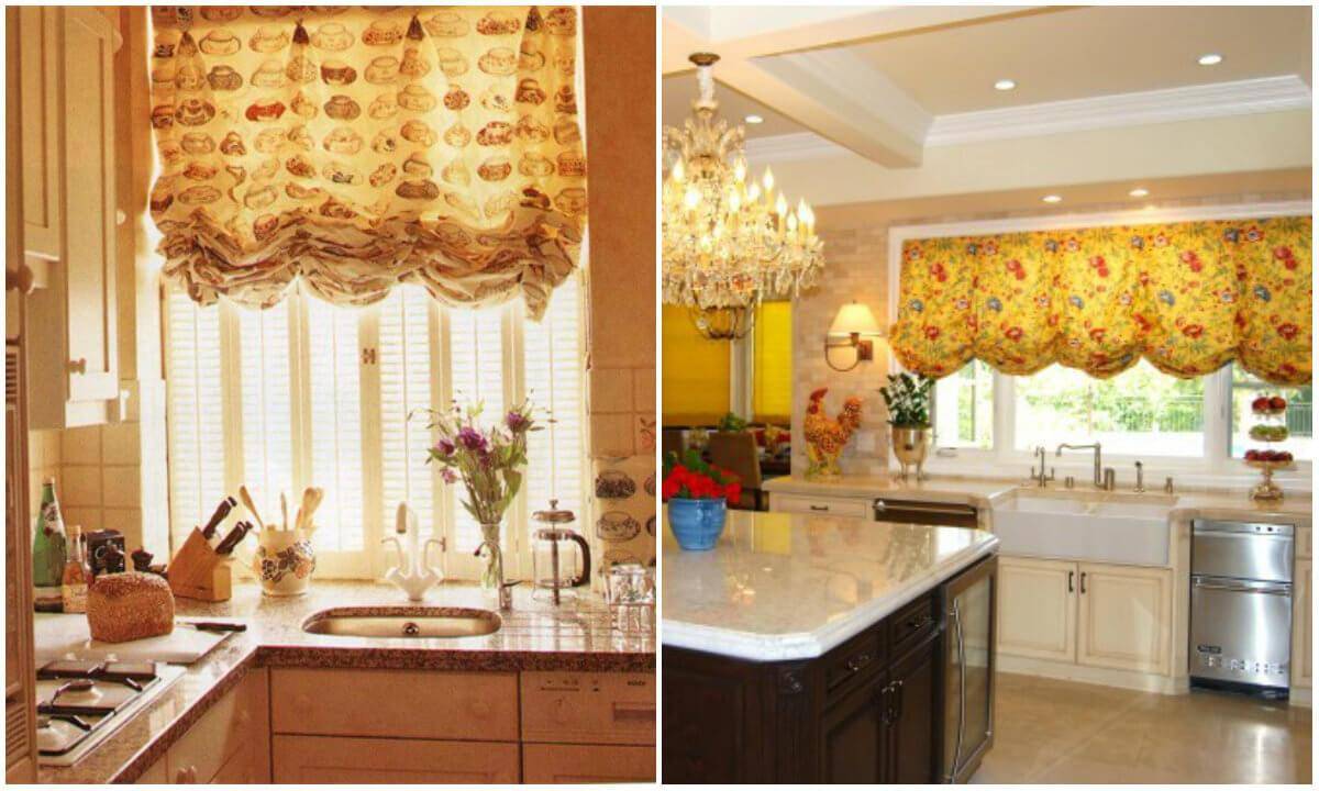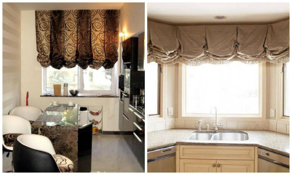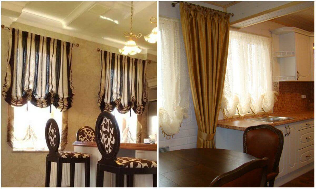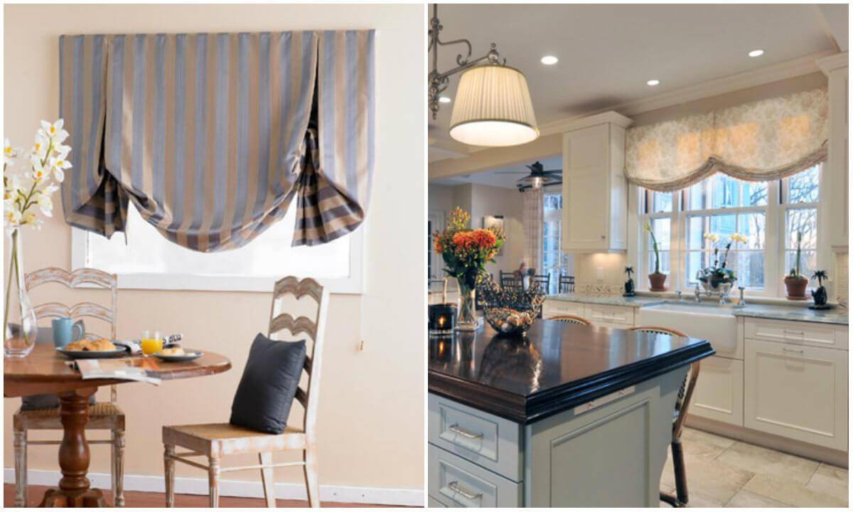 Короткие шторки могут быть выполнены в английском стиле (собираются в горизонтальные складки и фиксируются шнуром на необходимой высоте), более вычурные французские и австрийские шторы (текстиль драпируется). Как правило, такие сложные шторы — прерогатива просторных кухонь.