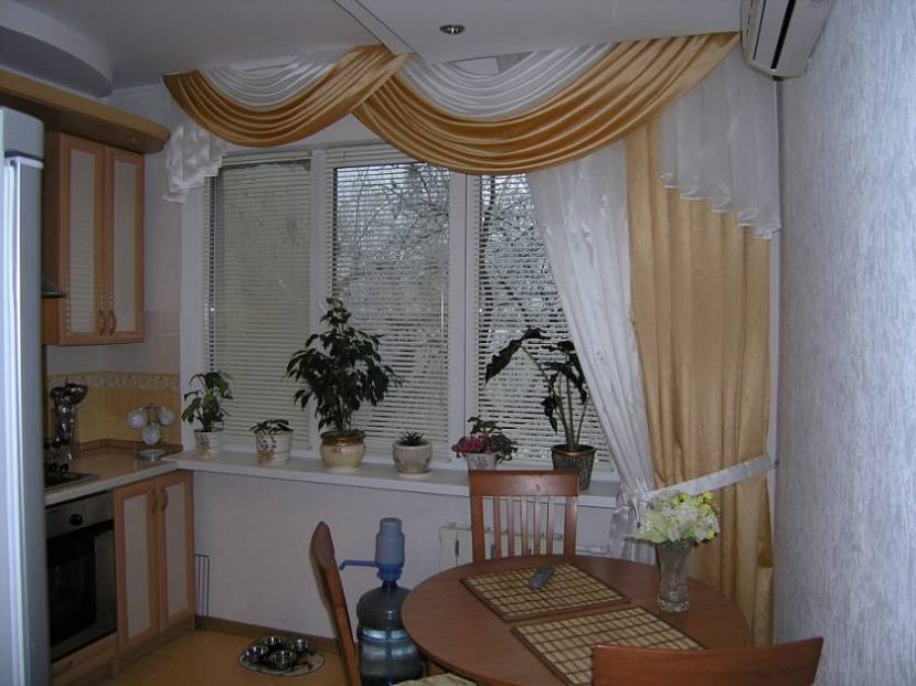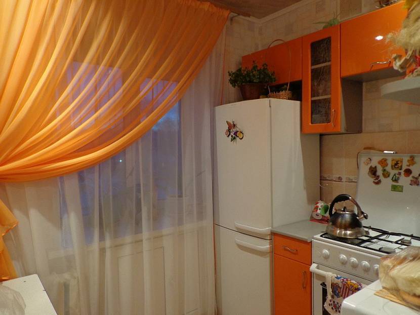 Ремарка: выбор штор на кухню с балконной дверью отличается — тут обычные длинные шторы в пол становятся рациональным выбором.
