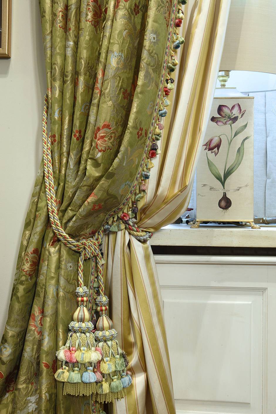 Внешне они представляют собой отдельные секции, прибираемые по нижнему краю в форме воздушных воланов или пышных складок. Повышенную декоративность придает контрастная отделка кантом, бахромой, шнурами, декоративными кистями.