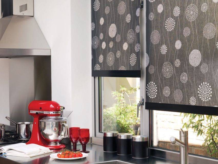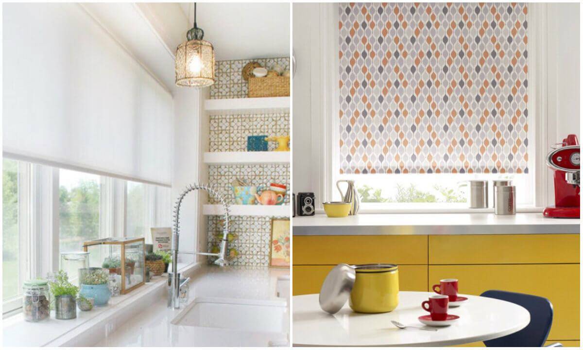 Рулонные шторы. Имеют цилиндр в основании, на который при закрывании наматывается ткань. Поэтому, в отличие от римских, полотно ткани всегда ровное. Могут устанавливаться на 1 створку окна, либо на весь оконный проём. Если ткань сбоку ничего не удерживает, называются свободновисящими. Если перемещается по направляющим и плотно прилегает к окну – кассетные. По дизайну рулонные уступают римским, а многие вообще относят их к офисным вариантам (как жалюзи) и считают кухни с ними неуютными.