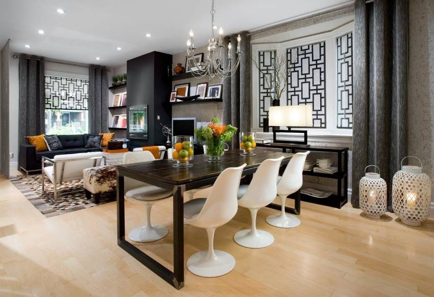 Вместо обычного тюля обрати внимание на шелк или органзу с тонкой декоративной вышивкой. Но учти, что за классическими шторами сложнее всего ухаживать, так что вешай их в обеденной зоне