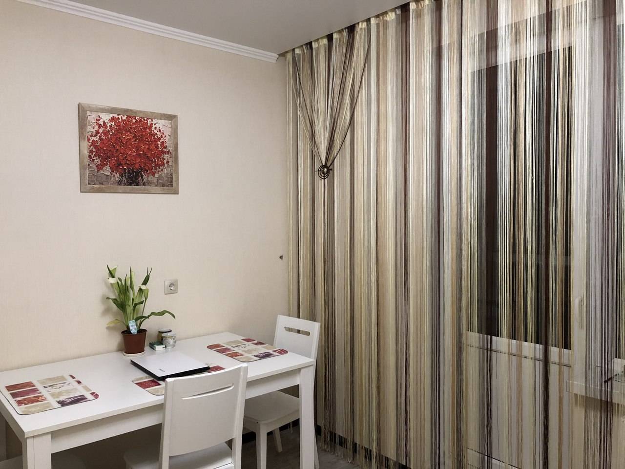 - Кисея. Еще называется нитяная шторка. Состоит из сотен тонких веревочек и поэтому отлично подходит для кухни. Пятен и загрязнений на ней вообще не видно.