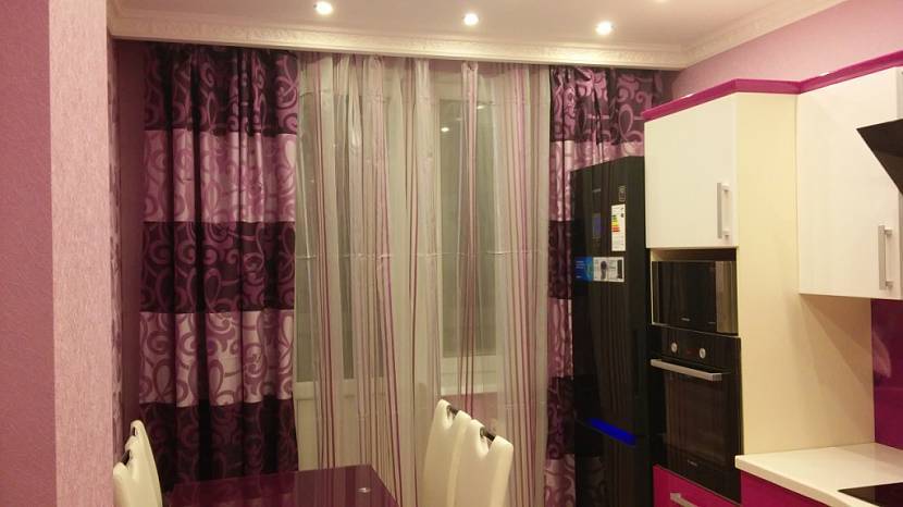 Шторы-фон должны быть подобраны в тон основному цвету кухни. Не желательно, чтобы они были светлее или темнее, иначе контраст будет проглядываться.