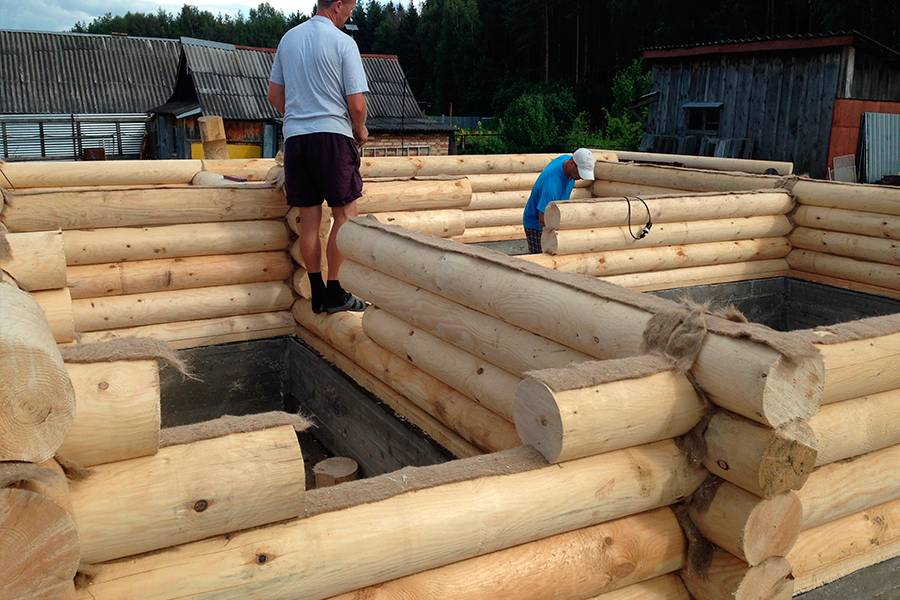 На отстоявшийся фундамент закладывается гидроизоляция и переходим к монтажу первого венца. Он играет важную роль в качестве и долговечности постройки. От нижнего венца зависит как пройдет усадка конструкции. Выводим нижние звенья строго по уровню. Если для строительства банного комплекса выбрано бревно профилированное, соединяем аккуратно звенья в замок. Проверяем плотность прилегания. Если имеются зазоры, прокладываем утеплитель. Совсем недавно для этого применялся мох или пакля. Сейчас рынок пестрит их заменителями, но предпочтение лучше отдать джутовому утеплителю. Он уменьшит нагрузку верхнего ряда на нижний, лучше сохранит тепло.