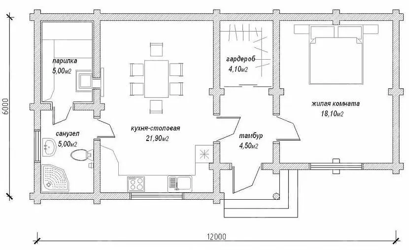На схеме проекта планировку допускается изменить, переставив дверные проёмы. Не все приветствуют расположение входа с улицы сразу в комнату отдыха. Это можно исправить наличием террасы, где удобно расположить мангальную зону, мебель для отдыха, обеденный стол.