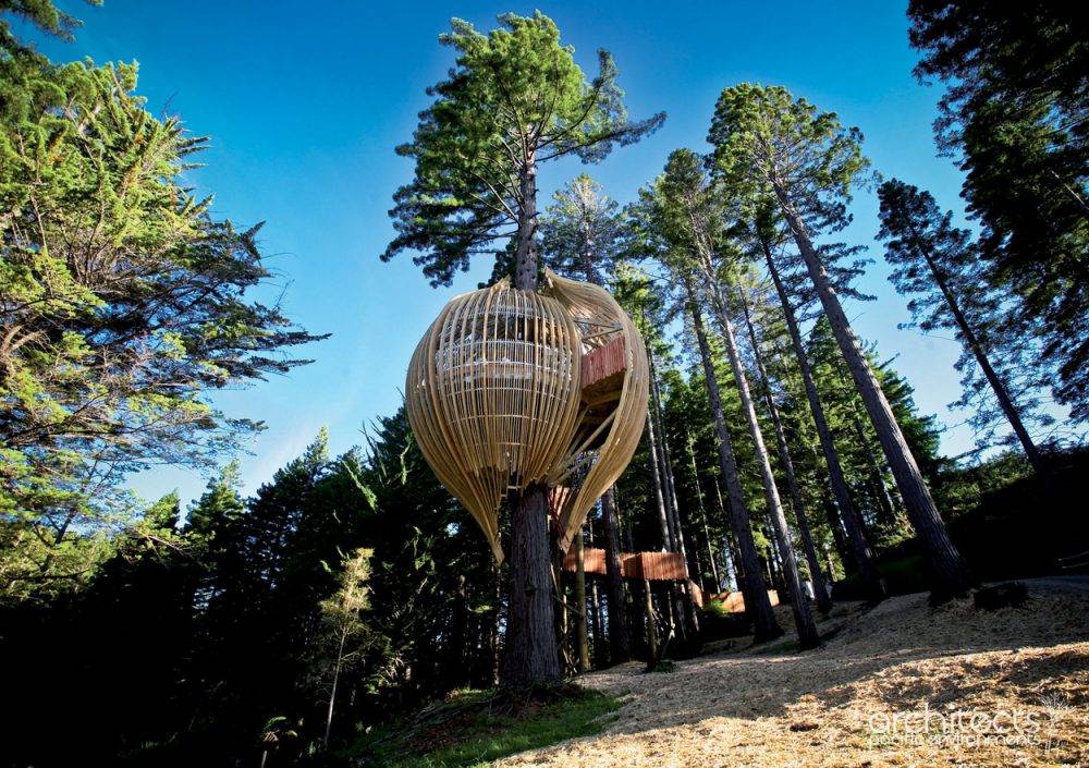 Дом Yellow House, архитекторы Pacific Environments Architects Ltd, в Окленде, Новая Зеландия; является рестораном, построенным на 40-метровом дереве с диаметром у основания — 1,7 метра