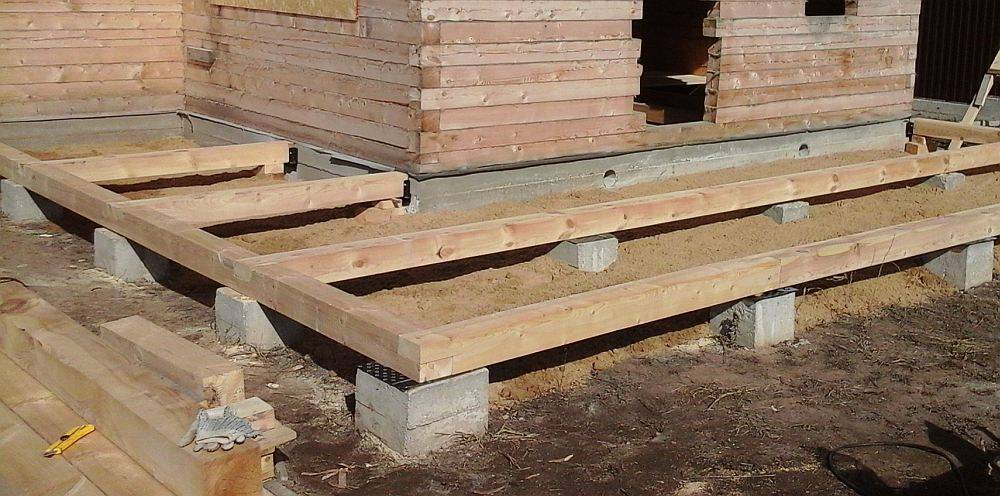 Для обустройства напольной поверхности внутри фундамента делают подушку из керамзита и бетонную стяжку, либо монтируют каркас из деревянных балок перекрытия и лаги для последующего устройства деревянного пола.