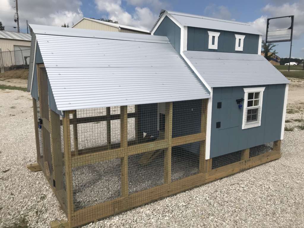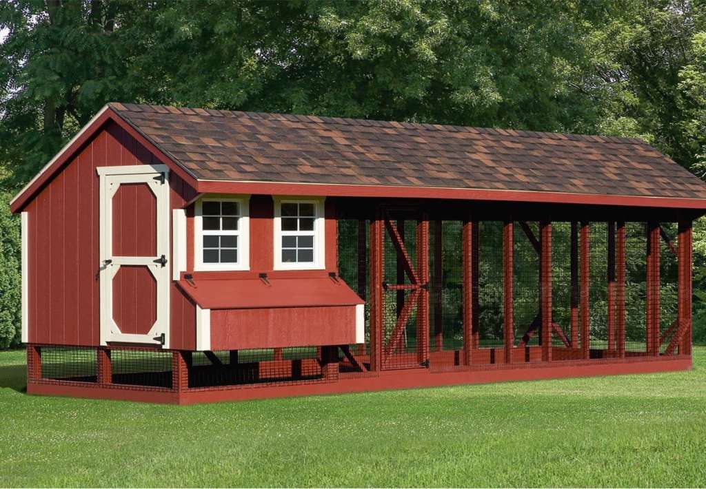 Внешне домик для пернатых может выглядеть следующим образом. Такой курятник на 20 кур, построенный своими руками, может использовать как зимний, так и летний вариант.
