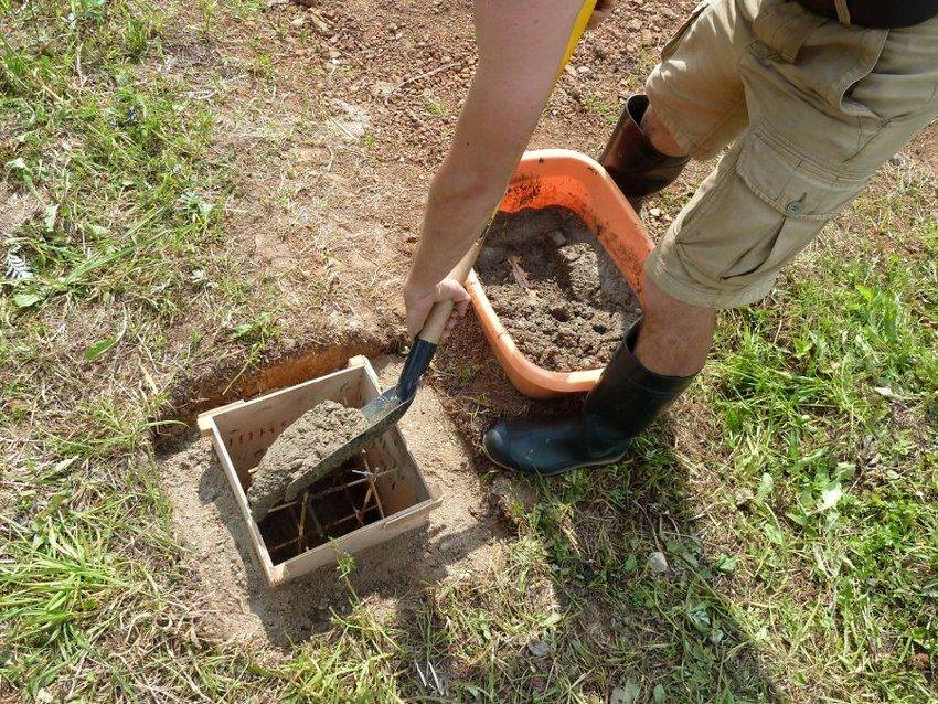 - Прежде чем заливать бетон, вставьте в шурфы арматуру с нарезанной резьбой.