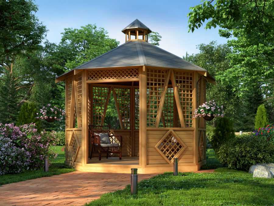 Садовые конструкции в виде многоугольника немного сложнее в строительстве относительно простых прямоугольных построек, но выглядят они более оригинально и эффектно. Чтобы беседка была не просто функциональной, но и стала украшением садового участка, декорируйте ее красивой деревянной решеткой или изящной ковкой, растениями, подберите сценарий освещения.