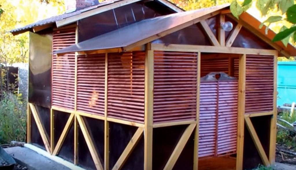 - комбинированное строение — хозяйственный блок, совмещенный с открытой беседкой или летней кухней под навесом.