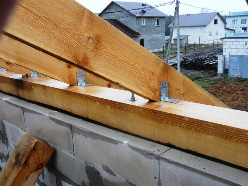 Мауэрлат. Представляет собой опору, которая соединяет крышу со стеной. Для легких крыш используется обычный брус из твердых пород дерева. Равномерная нагрузка позволяет создать высокое качество соединение. Если при изготовлении крыши используются толстые балки из тяжелых пород дерева, возможно установить металлический швеллер. Это позволит в значительной мере увеличить прочность соединения. С легкими крышами использование металлического профиля противопоказано, так как он только увеличить давление на фундамент.