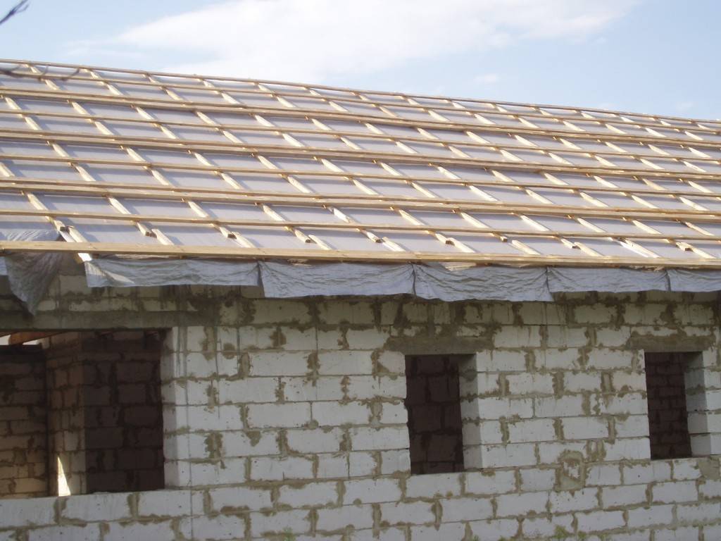 По стропилам необходимо набить пленку, которая будет являться гидробарьером. Пленку нужно крепить к стропильным ногам при помощи строительного степлера. Гидробарьер нужен для того, чтобы влага от растаявшего снега, который может замести под шифер, или от дождя, стекала по пленке вниз и смогла нанести вреда вашему дому;