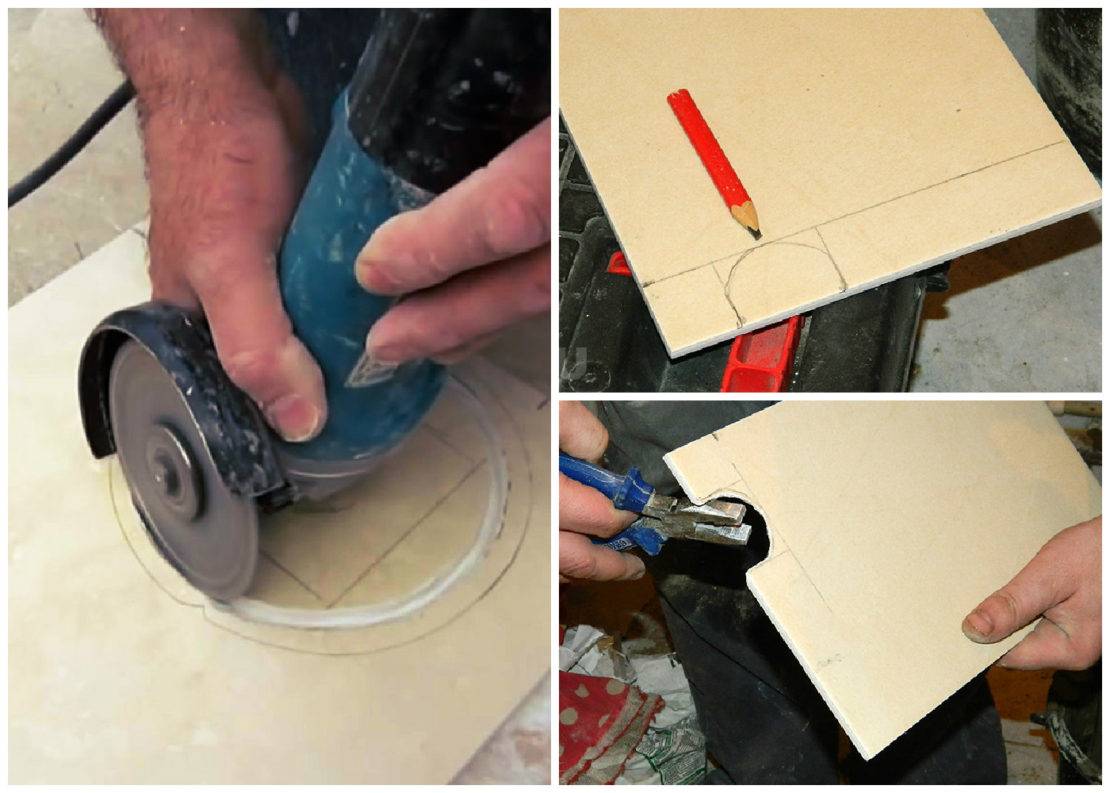 Предварительно на плите размечается форма выреза. Это может быть угол или даже округлость для установки плитки в месте выступа стены или выхода трубы. После этого либо на электрическом станке аккуратно и частями вырезают все лишнее, либо используют щипцы.