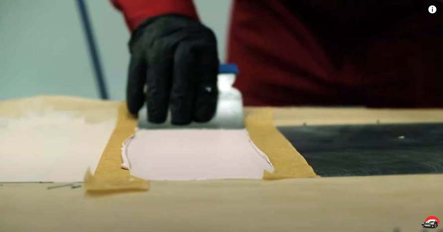 В качестве поля для эксперимента мы подготовили небольшую металлическую панель авто, которую поделили на равные части. Начинаем со стандартного варианта. Нужно развести 100% шпатлевки и 3% отвердителя. В нашем случае мы будем смешивать 50 граммов белой шпатлевки с 1,5 граммами красного отвердителя и так далее по нарастающей, каждый раз уменьшая процентное соотношение отвердителя в два раза. Неудивительно, что последняя пропорция автомобильной шпатлевки и отвердителя была похожа на малиновый йогурт.