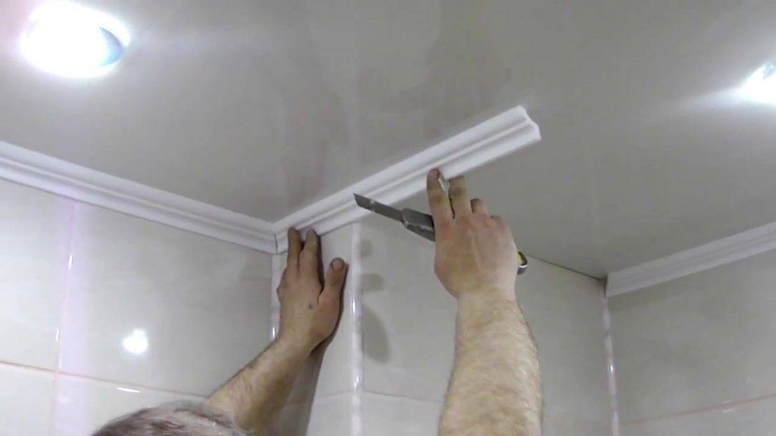 Выбираются узкие материалы из пенопласта, у которых верхняя часть такая же, как нижняя. Тогда получится нанести клей только на участок, крепящийся к стене, натяжной потолок задевать нельзя. Клеевой раствор должен отличаться высоким уровнем сцепления.