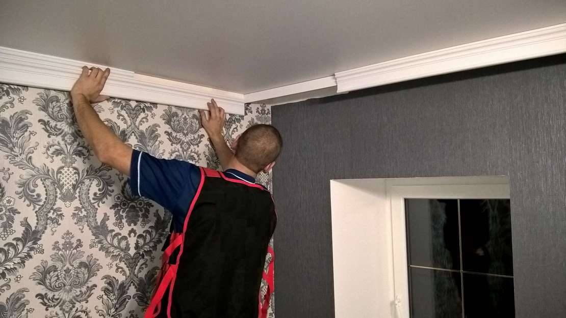Кроме этого, настенный крепеж используется при установке декора в комплексе с натяжными потолками. Приклеивать к ним деталь нельзя, поэтому клеевой смесью смазывают только участок молдинга, который крепится к стене.