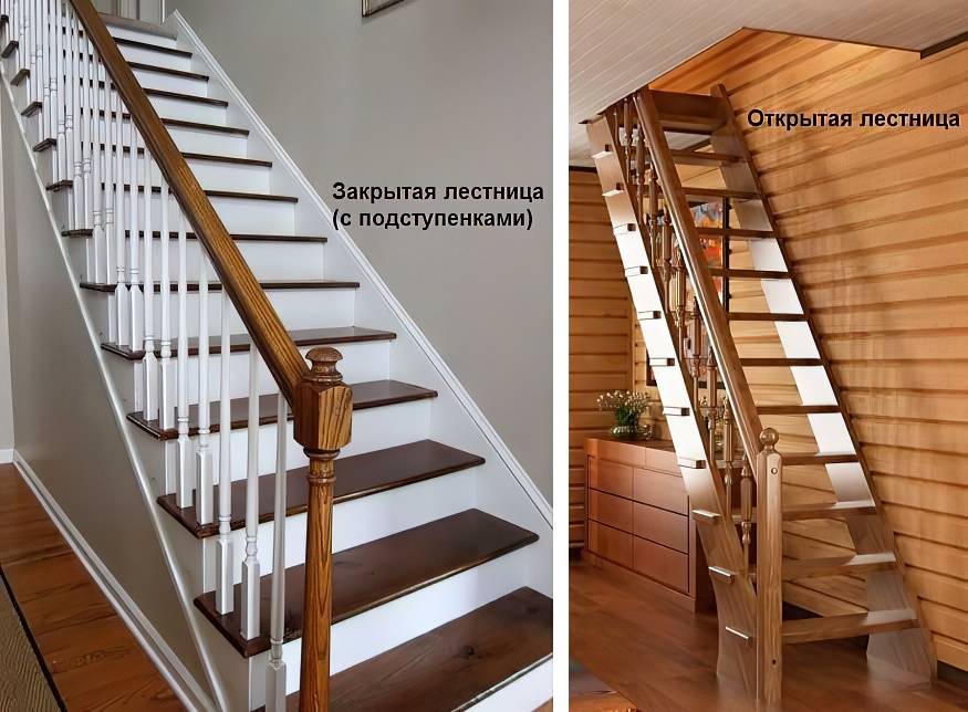 Кроме того есть два вида степеней — открытые и закрытые. В открытых лестницах есть только горизонтально расположенная часть — сама ступенька, в закрытых — еще и вертикальная часть — подступенок.